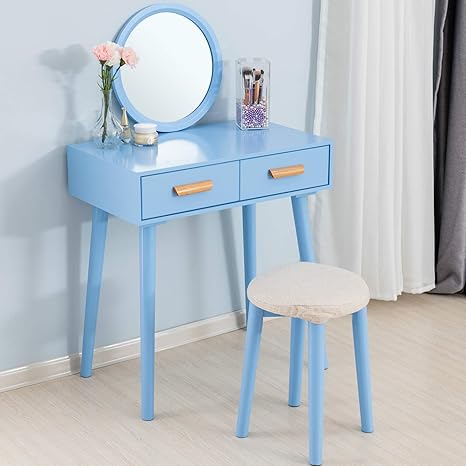 Mecor Vanity Table Set Blue Makeup Vanity With Round Mirror Wall Mounted Height Adjustable Wood Dressing Table With Cushioned Stool Two Drawers Kids