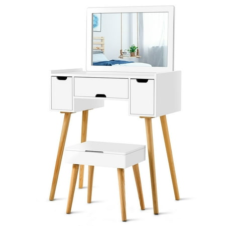 Wood Makeup Dressing Table Vanity Set Jewelry Storage Stool 4 Drawer Mirror