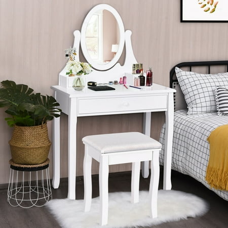 Gymax Bathroom Wooden Mirrored Makeup Vanity Set Stool Table Set White