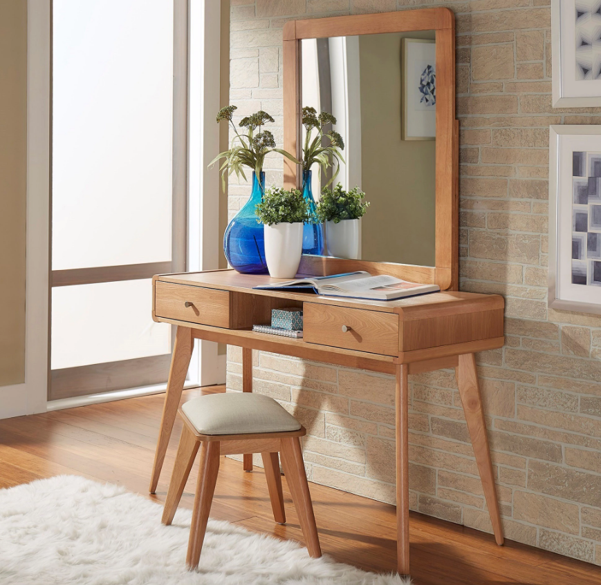 Modern vanity table with mirror. A mid century style vanity with matching stool. You can find vanity tables with various size mirrors including ones that are easily adjustable. Youre makeup vanity occupies a prominent place in your bedroom so its only natural that you want it to complement the furniture and decor around it.