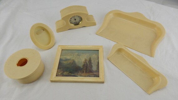 Rare Old Vintage French Celluloid Ivory Pyralin Vanity Set Clock Pictures Pans