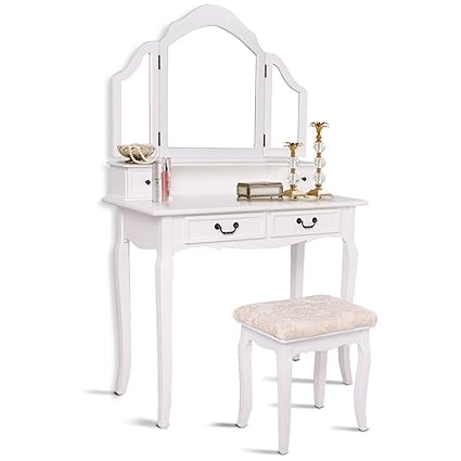 White Vanity Table Folding Mirror Stool Set 4 Drawer Bedroom Makeup Desk