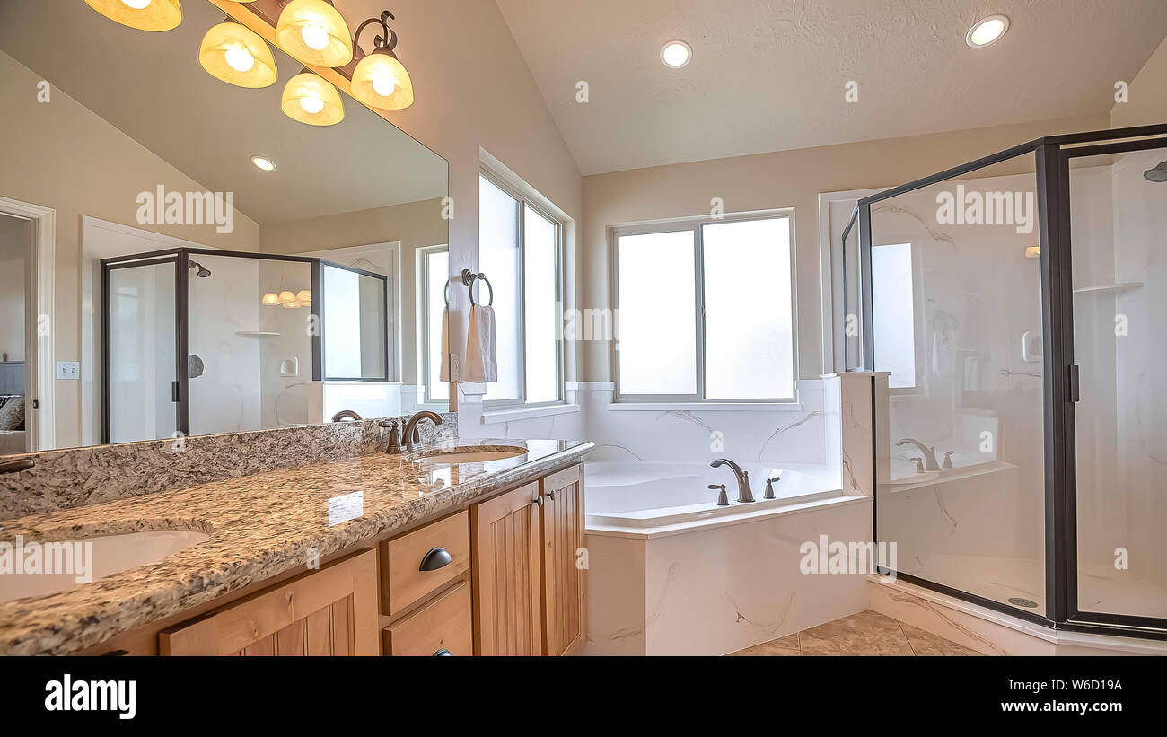 Panorama Interior Of A Cozy And Well Lighted Bathroom With Vanity